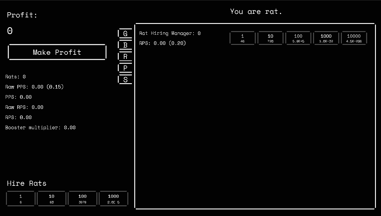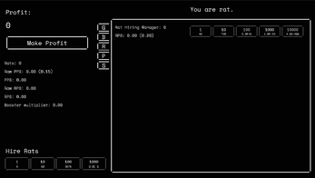 Once you have enough profit, use it to buy rat generators in the generators [G] tab. Rat generators create more rats to work for you.